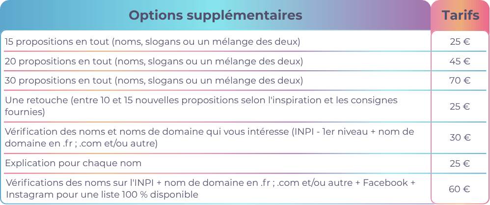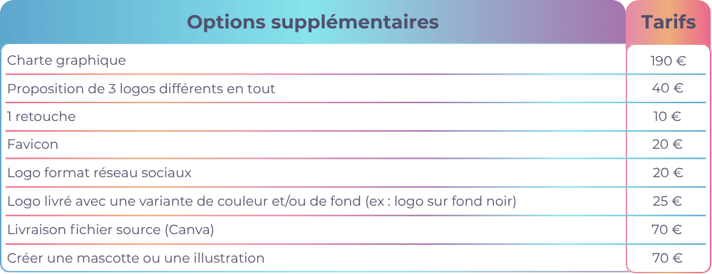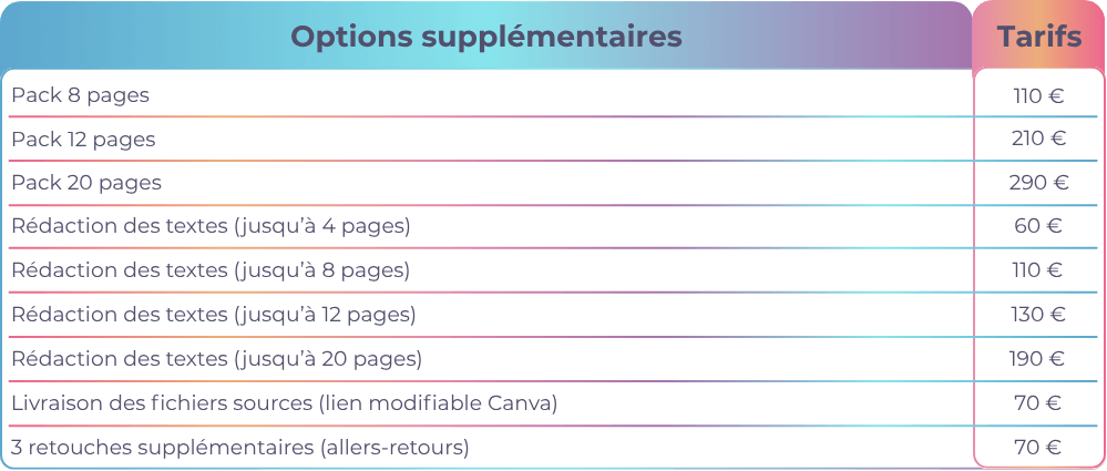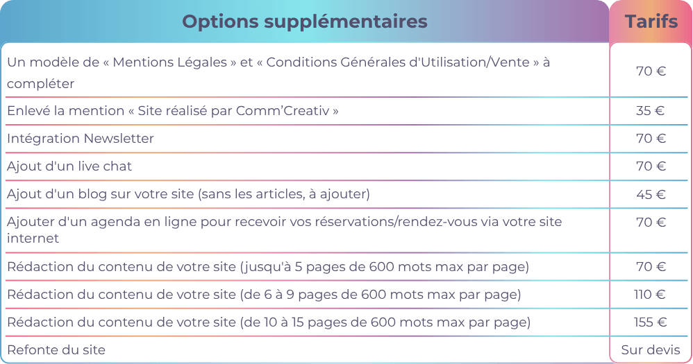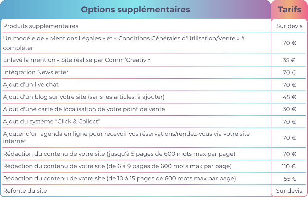 Les options supplémentaires se combine avec un pack. Seul la refonte du site peut être prise unitairement.