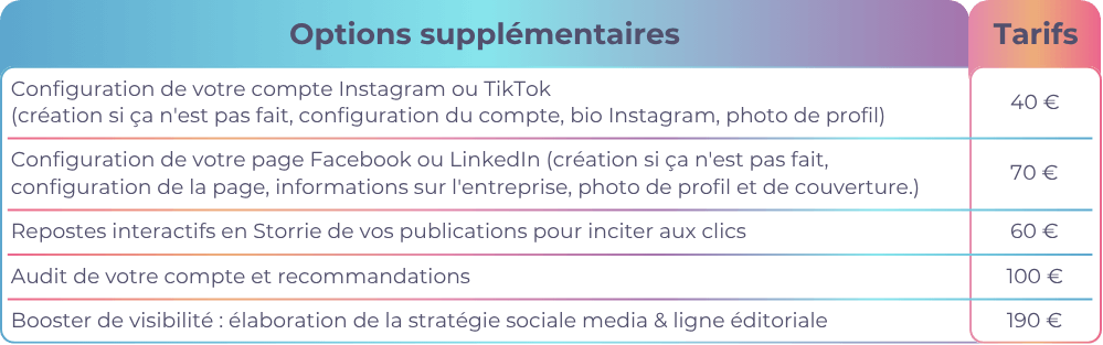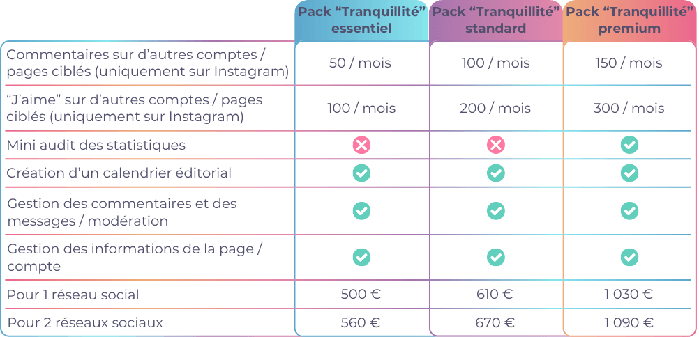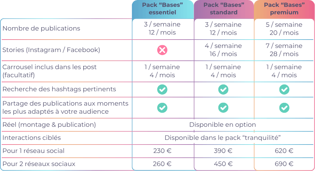 Je vous propose différentes offres mensuelles disponibles pour Facebook, Instagram, Twitter et LinkedIn.